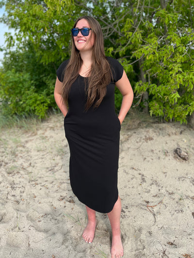 This cute & casual black maxi dress features a scoop neckline & dolman short sleeves.  It has side pockets with a side slit, curved hemline & a midi length. The material is soft & stretchy and will help keep you cool and comfortable in the summer heat. Can be worn on its own or complete your look with a jean jacket, cardigan or blazer.